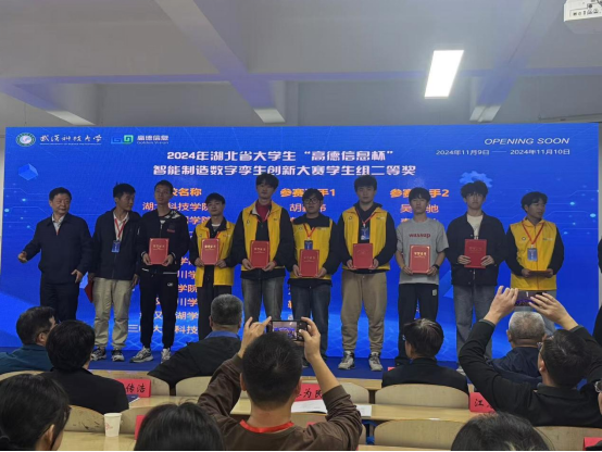 “高德信息杯”智能制造数字孪生创新大赛属于国家A类学科竞赛,由湖北省高等教育学会金工教学专业委员会主办、湖北省机械工程学会、工业工程专业委员会协办,武汉高德信息产业有限公司提供技术支持,活动旨在通过这一赛事平台,充分激发学生的创新思维活力,全面增强其实践操作技能,并着力培养其解决跨领域工程难题的能力。这一成绩充分彰显了学院对培养技术人才的高度重视,不仅有助于推动教学改革与产业需求的深度融合,也有助于学院学科建设的高质量发展,更为实现工业和信息化领域人才培养的高质量发展目标奠定了坚实的基础。