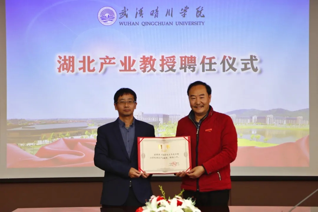 聘任仪式开始,校长助理杨旦宣读《省委人才办、省教育厅关于印发2021年“湖北产业教授”入选名单的通知》文件,并介绍叶艳军教授的基本情况。董事长、校长汪彬教授为叶艳军教授颁发聘书及校徽。