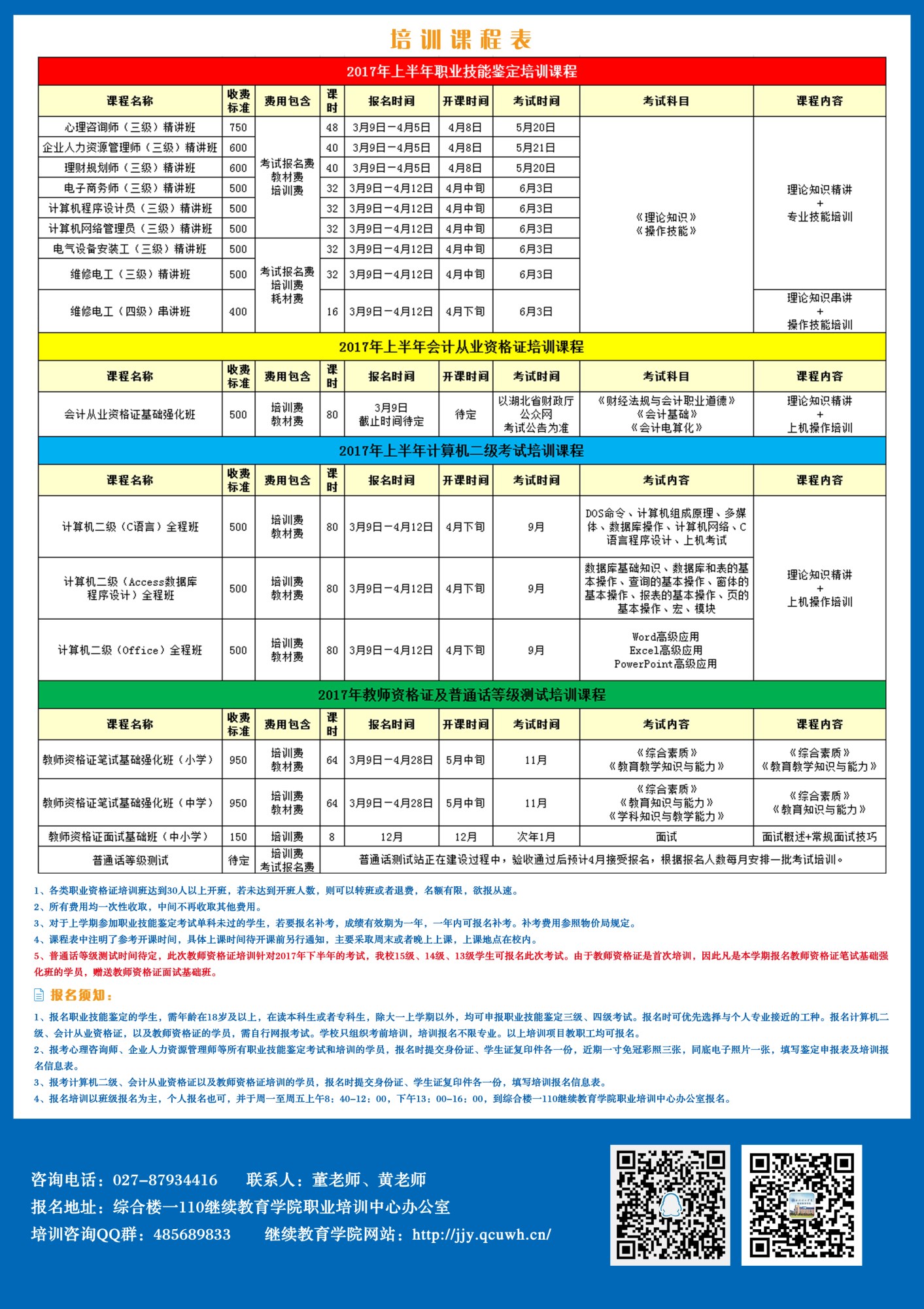 本学期主推的培训项目有:心理咨询师、企业人力资源管理师、理财规划师、电子商务师、计算机程序设计员、计算机网络管理员、电气设备安装工、维修电工、会计考证、计算机二级、教师资格证,以及普通话测试(培训课程参照附件一)。