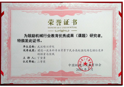 由丁坚勇、刘亚等老师主持完成的湖北省教育科学规划重点课题《建设一流本科专业背景下民办高校强化特色错位竞争的探索和实践》斩获教育优秀成果(课题)二等奖。课题立足民办高校发展实际,深入剖析在建设一流本科专业过程中的痛点与机遇。经过多年实践与探索,创新性地构建了一套完整的民办应用型机电专业特色发展体系。课题团队精准把握行业发展趋势,聚焦新能源机电技术、智能装备制造等前沿领域,探索并实践机电融合、校企联合、课赛创结合的“三合”应用型人才培养模式。课题避开与公办高校的同质化竞争,积极推动校企深度融合,与多家行业头部企业共建实习实训基地,开展订单式人才培养项目,让学生在真实项目场景中锤炼专业技能,实现人才培养与企业需求的无缝对接,推行专业课程组与大学生竞赛、科技创新的组织指导对接,不断扩大学生竞赛参与面,促使竞赛成绩持续稳定增长,学生科创和专利作品更加丰富多彩。该课题研究成果不仅为本院专业建设提供了指导,也为全国民办高校的特色化发展提供了可复制、可推广的宝贵经验。