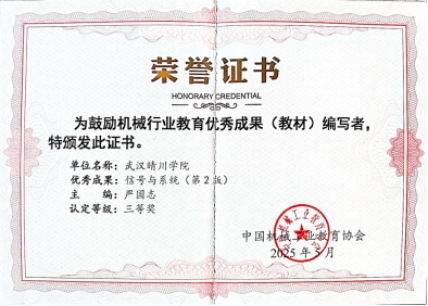 严国志老师主编的本科教材《信号与系统》荣获教育优秀成果(教材)三等奖。《信号与系统》作为电气、机械两大专业的核心课程,传统教材往往存在理论晦涩、案例陈旧等问题。严老师教学团队凭借深厚的专业功底与丰富的教学经验,重新架构教材内容,将 5G 通信、智能交通等新兴领域的信号处理案例融入其中,让抽象的理论知识变得通俗易懂。同时,教材注重知识的系统性与实用性结合,配套开发了线上学习资源、习题解答手册、实验指导手册、程序源代码等学习和教学资源,打造 “纸质教材+数字资源” 的立体化教学体系。教材还创新性地引入项目式学习模块,引导学生通过实际项目掌握信号分析与处理技能。该教材一经推出,便在多所高校得到广泛应用,有效提升了学生的学习兴趣与课程教学质量,成为行业内颇具影响力的优秀教学资源。