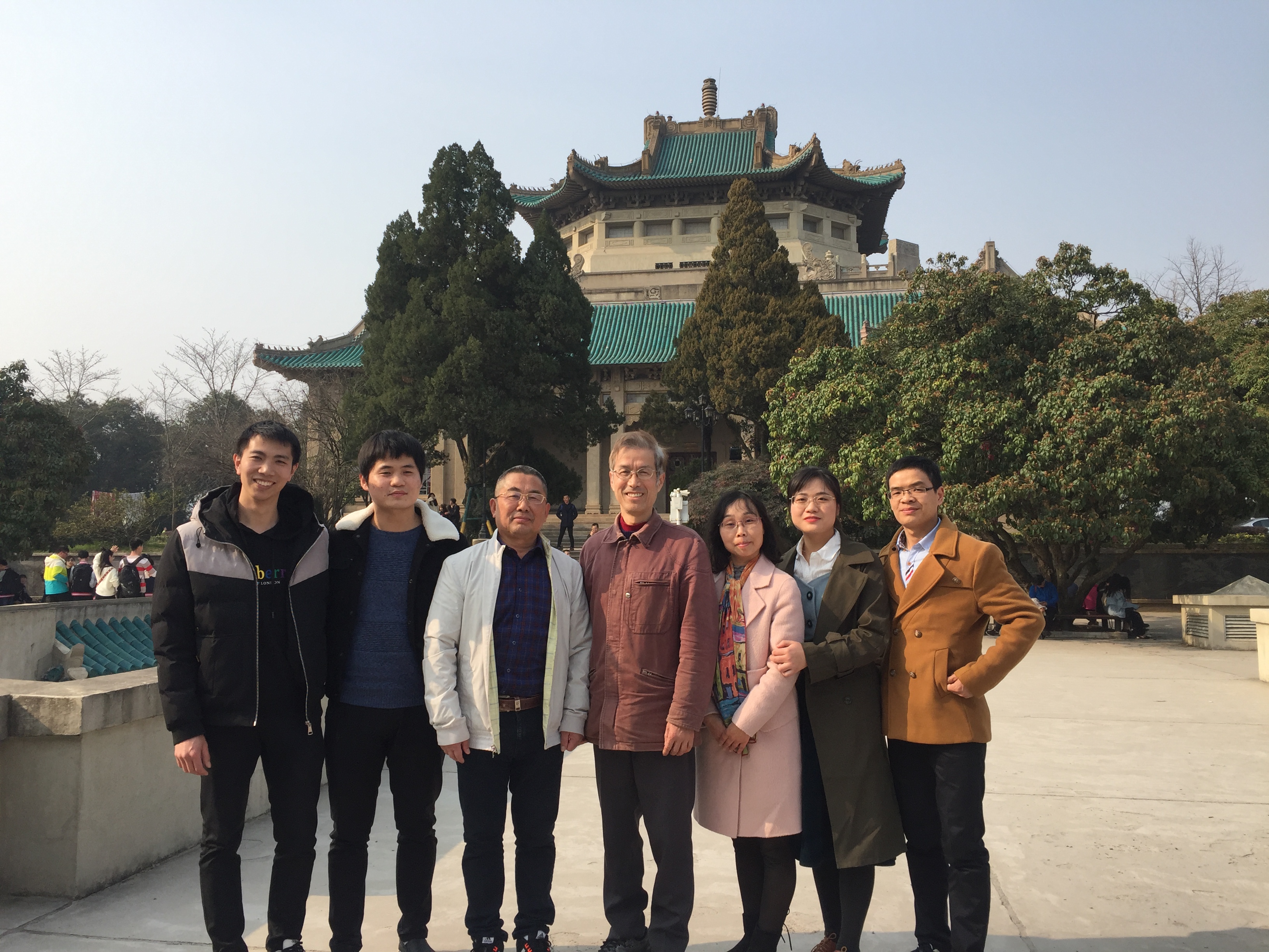 图为四位优秀晴川电气学子(右一:黄事成;右二:黄文慧;左二:周陟;左一:金德成)与他们的研究生导师们在美丽的武大校园。