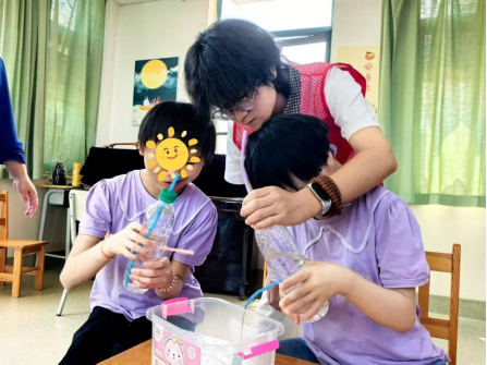 科学课上,志愿者们又带领孩子们进行了一项科学实验——制作简易饮水器。利用矿泉水瓶和两个吸管,通过大气压强的原理,孩子们成功制作出了一个可以自动出水的饮水器。这一实验不仅让孩子们体验到了科学的魅力,也激发了他们对科学探索的兴趣。