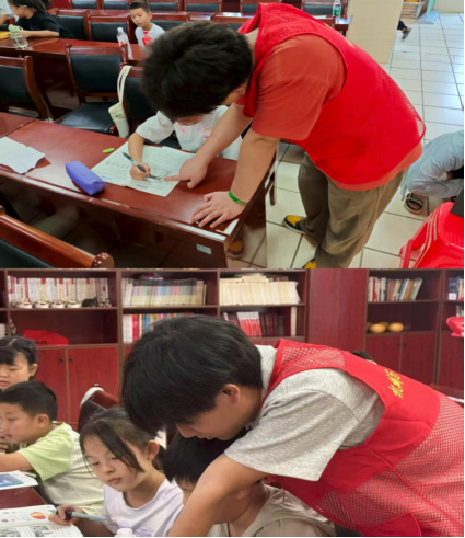 课间休息后,学院志愿者化身“小老师”,针对同学们的暑假作业答疑解惑,进行作业辅导。老师们细致讲解题目,引导学生独立思考,同学们积极配合,高效完成学习任务。
