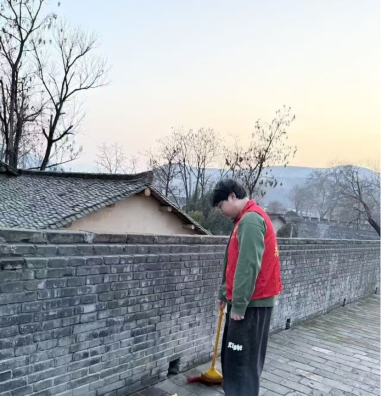 寒假期间,党员李文洋主动报名参加了家乡古城的志愿清理活动。当他握着扫帚,在青石板路上清扫落叶与尘土时,脚下的每一块砖、身边的每一面墙,都仿佛在诉说着岁月的故事。古城的青砖黛瓦,是家乡的文化根脉,也是当代人需要守护的精神家园。