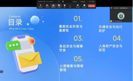 刘洋老师则从暑期出行交通安全、兼职与实习实训安全、暑期实践安全等方面,告诉学生“安全小常识”及“各类安全注意事项与应急办法”,保障安全。