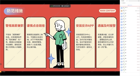 辅导员张爽子分班级,重点针对防境外“高薪”诈骗、防溺水、防交通事故等,结合视频、抖音、网站警示案例对同学们进行了警示和危险识别预防教育,并在学生群内特别提醒:“天上不会掉馅饼”“出门一定要跟父母报备”“不要轻易相信任何人”。