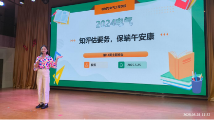 2025年5月25日17:30-18:00,2024级全体同学在辅导员段芳老师的组织下于晴川剧场召开了“知评估要务,保端午安康”主题班会,围绕校园安全、迎评促建及学风建设三大重点展开部署。