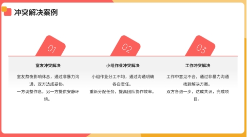 “冲突解决实验室”结合实际场景,剖析需求冲突、观念冲突和情感冲突产生的原因,并给出非暴力沟通四步法,还以室友、小组作业、工作场景中的冲突解决为例,提供了实用的解决思路。