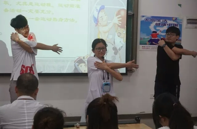随后,专题讲座正式开始,主要内容分三个部分: 1、《户外急救-心肺徒手复苏》,主讲者:段恋;2、《运动损伤-常规处理》,主讲人:田松;3、《世界无烟日宣传—烟草和心脏病》,主讲者:李双。
