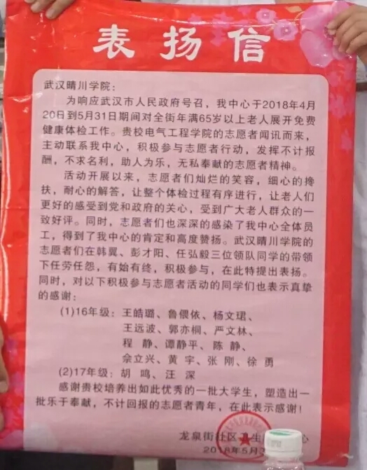 在讲座正式开始之前,我们收到了来自龙泉社区卫生服务中心准备的一份意外惊喜——一封表扬信。此封表扬信,是龙泉社区卫生服务中心针对电气工程学院在4月23日至5月25日期间,派遣了一批优秀的学生志愿者在龙泉社区进行义务工作,志愿者们出色的业务能力得到了社区和卫生院一致好评,因此,在接下来的专题讲座合作中,专程带来表扬信,表达了对晴川学子的感谢。